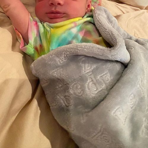 Tra uno scatto e l’altro, Halsey mostra anche il suo bimbo mentre sonnecchia avvolto in una coperta di morbida ciniglia grigia.