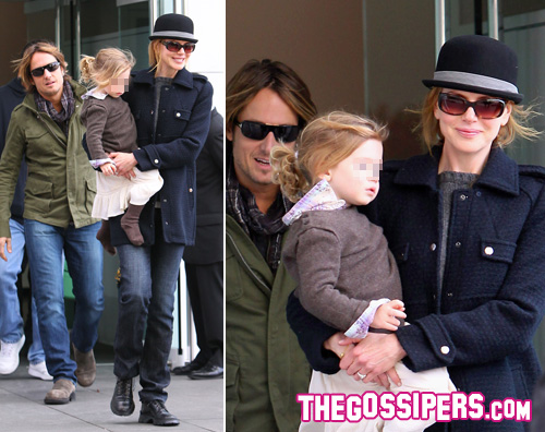 Con in braccio la piccola Sunday Rose e seguita dal marito Keith Urban, l’attrice si è diretta verso un’auto privata riparandosi dal vento con un cappotto e una bombetta.