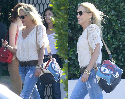 Tra queste c’è anche Sharon Stone, fotografata fuori dal ristorante Cecconi con una borsa raffigurante l’attuale presidente degli Stati Uniti.