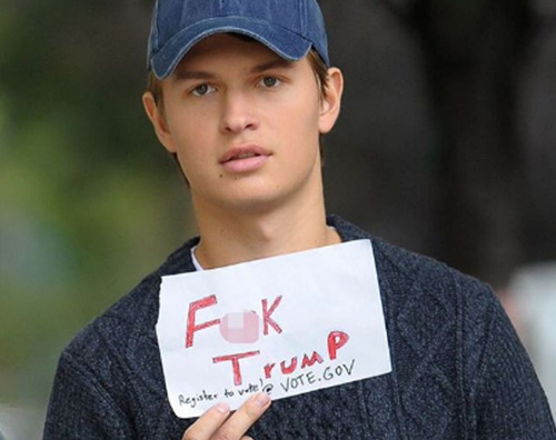 Fotografato durante un momento di pausa, Elgort ha esibito un cartello con su scritto “Fuk Trump. Per votare registratevi su vote.gov).