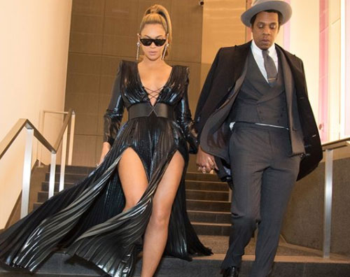 Con una scollatura davvero audace e due spacchi che lasciano ben poco all’ immaginazione, Queen B ha posato accanto a su marito Jay Z, anche lui elegantissimo con tanto di completo grigio e capello in pendant.