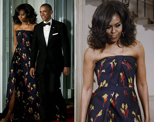 Superba, lasciatemelo dire, la padrona di casa Michelle Obama che ha accolto i suoi invitati in uno splendido abito scuro flower print che metteva in mostra braccia toniche ed un decolletè super hot.