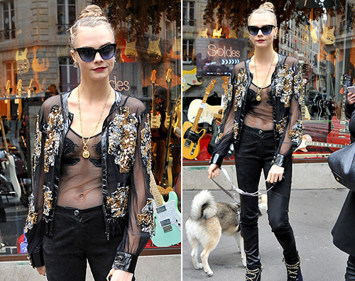 Per l’ occasione Cara ha scelto un outfit decisamente poco vistoso, di quelli che potremmo tranquillamente sfoggiare anche noi per andare a comprare il pane nel forno sotto casa. Maglia trasparente portata senza reggiseno abbinata ad un bomber nello stesso tessuto sapientemente incrostato di perline e ricami per nascondere i seni, skinny neri ed un delizioso cagnolino portato al guinzaglio a farle da accompagnatore ufficiale.