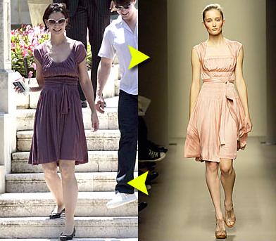 Katie Holmes a confronto con la modella Iekeliene Stange sulla passerella di Bottega Veneta. Per un primo piano delle scarpe
