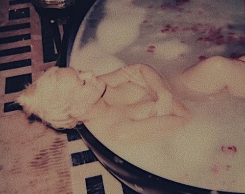 Questa volta la cantante ha deciso di farsi immortalare mentre si gode un bagno rilassante nella sua vasca da bagno piena di bollicine e petali di rosa, con i suoi capelli biondi raccolti in uno chignon e le mani incrociate sul seno per non cadere nella censura del social.