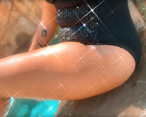 “Credevo sinceramente che non fosse reale la guarigione dai disturbi alimentari. Che tutti fingessero o che ci ricascassero segretamente. ‘Sicuramente vomita qua e là’, ‘ non è possibile che accetti la sua cellulite’… queste sono alcune delle cose che mi ripetevo crescendo. Invece sono davvero grata di poter dire per la prima volta nella mia vita che la mia dietista mi ha guardato e mi ha detto: ‘Questo è l’aspetto del recupero dai disturbi alimentari’. Siccome sono grata per il posto in cui mi trovo oggi, ecco qui alcuni scatti che ho fatto l’estate scorsa in quarantena quando volevo celebrare le mie smagliature invece di vergognarmene. Ho voluto ricoprirmi di vernice glitteriata per celebrare il mio corpo e tutte le sue caratteristiche. Le mie smagliature non vanno via, quindi posso regalar loro un po’ di luccichio, no? “