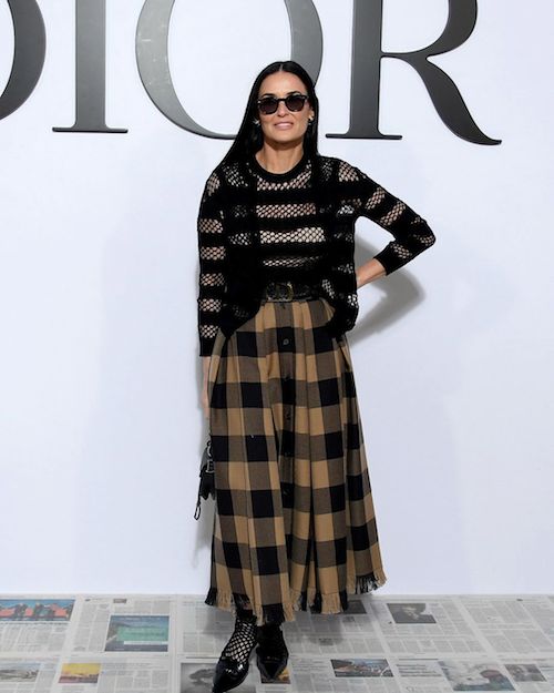 Naturalmente, tutte e tre le attrici erano firmate Dior dalla testa ai piedi, qui sotto una foto col look completo di Demi Moore che ha sfoggiato una lunga gonna a quadri e un maglioncino con lavorazione a rete che riprendeva il mood delle calze.
