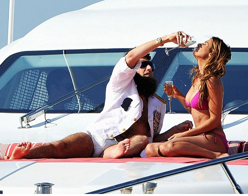 In queste foto vediamo la Canalis a bordo di uno yacht nei pressi di Cannes, impegnata in una messinscena promozionale che la vede flirtare con il generale Aladeen, il nuovo personaggio di Cohen protagonista de “Il dittatore”.