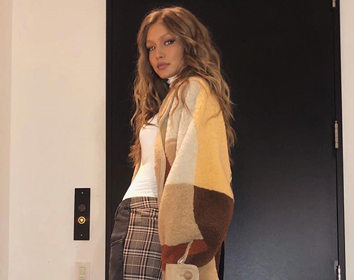 Cappotto oversize dai toni caldi, stivaletti animalier e jeans per metà neri e per metà a quadri, Gigi è pronta per esibire la sua tessera elettorale e poi correre alle prove per il Victoria’s Secret Fashion Show, in programma per domani a New York.