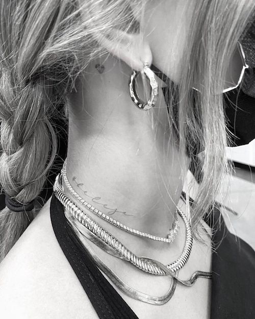 Si tratta di una J che Hailey si è fatta incidere sull’anulare sinistro, una sorta di fede indelebile che le ricorderà per sempre il suo legame travolgente col 26enne, e della scritta “beleza“, che fa bella mostra di sé sul collo della signora Bieber.