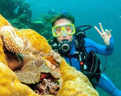Guardate bene la foto qui sopra, riuscite a riconoscere l’attrice che si nasconde dietro la maschera da sub?