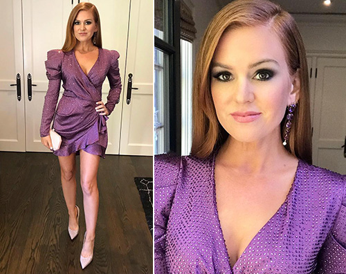 Per nulla superstiziosa, la rossa 43enne ha deciso di sfoderare il suo lato più sexy fasciando le sue curve femminili in un abitino a portagfoglo viola, completato da accessori nude. Vi piace?