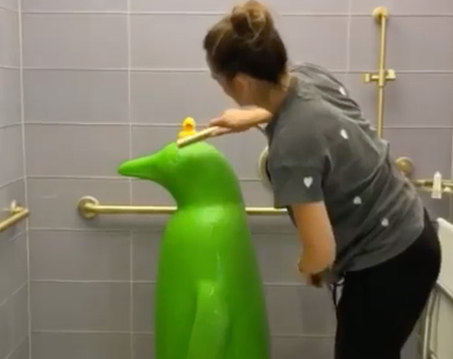 L’ex signora Affleck ha deciso quindi di ringraziare i fan in maniera piuttosto particolare e l’ha fatto con un video divertente. Al bando palloncini metal e torte personalizzate, Jen, in trasferta lavorativa senza i suoi bambini, ha preferito farsi filmare intenta a lavare un enorme pinguino in plastica verde nella doccia del suo hotel.