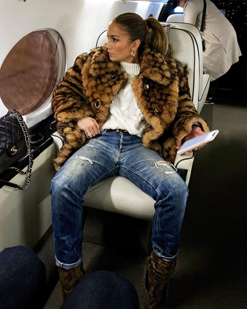 Pellicciotto animalier, maglioncino bianco e jans, Jenny ha deciso di viaggiare comoda, ma non ha rinunciato a un look stiloso, completato da una borsa di Chanel.