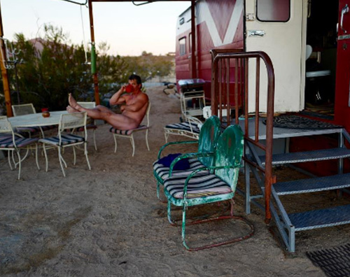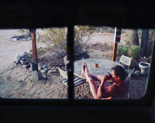 Seduto accanto al suo un maxi caravan, l’ attore se ne sta seduto a sorseggiare una tazza di caffè con le gambe sul tavolo.