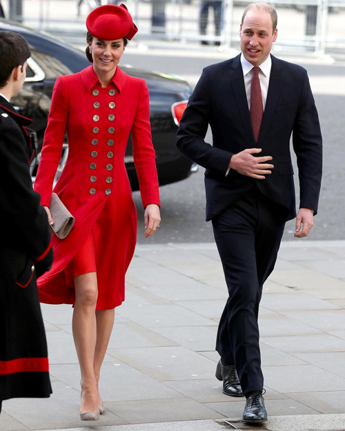 Per l’occasione la bella Middleton ha riciclato il suo abitino rosso con abbottonatura doppiopetto, già indossato in Australia quando il principe George era ancora figlio unico. A completarlo pochette e decolletè color tortora ed un meraviglioso cappellino.