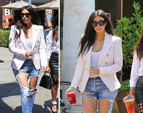 Per uscire a fare colazione da Starbucks la futura moglie di Kanye West ha scelto un paio di jeans strappati, dove per “strappati” intendo con dei buchi giganteschi ad altezza cosce.