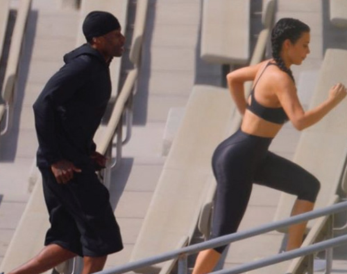 Kim, invece, non solo dimostra di essere davvero allenata, ma per il suo allenamento quotidiano non rinuncia neppure all’ idea di curare il suo stile: treccine laterali, leggings aderenti e top cortissimo, questo il suo look. Vi piace?