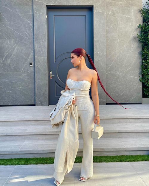 Con un competo aderentissimo color crema, Kylie ha sfoggiato capelli rosso fuoco e una lunghissima treccia.