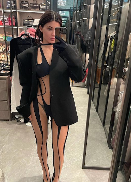 Nel primo scatto la giovane mamma e imprenditrice si mostra davanti allo specchio della sua cabina armadio con una tutina semitrasparente caratterizzata da dettagli nude e bande nere che accarezzano il suo corpo come una seconda pelle. Senza trucco e con i capelli raccolti, Kylie ci mostra la sua “tenuta casalinga” che fa impazzire i fan.