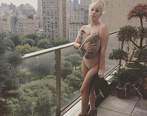 Body color carne, gambe nude, sopracciglia disegnate e rifinite con una fila di cristalli scuri e abitudini da “casalinga comune” come quella di posare seminuda sulla veranda di casa con alcune scarpe di Alexander McQueen in mano e spolverare una campana di vetro mentre la stanza si riempie di musica Jazz.
