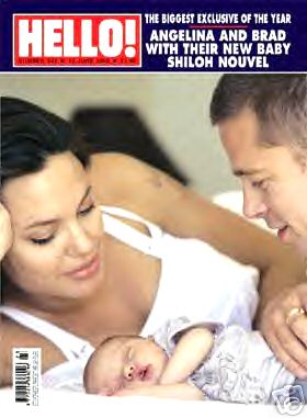 Oggi prima Getty Images e poi People hanno dichiarato di essersi aggiudicati l’esclusiva per più di 4 milioni di dollari!!! Ma nel pomeriggio è apparsa la copertina della rivista Hello! che dice di aver conquistato “l’esclusiva del bambino più atteso dell’anno”. Sono confusa! Comunque quella qui a fianco è la foto di Shiloh presente su Hello! Ovviamente per ora è solo una neonata uguale a tutti gli altri neonati del mondo.