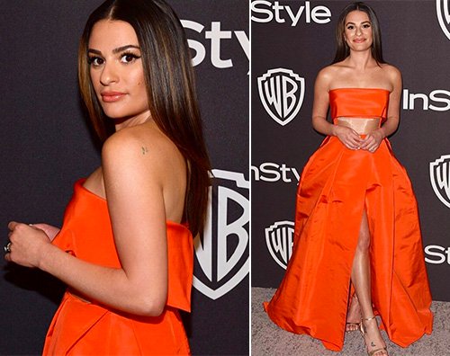 Per l’occasione Lea ha deciso di non passare inosservata e si è presentata davanti ai fotografi con un vistoso abito color mandarino dotato di gonna ampia e di una “finestrella” trasparente sul torace. Vi piace?