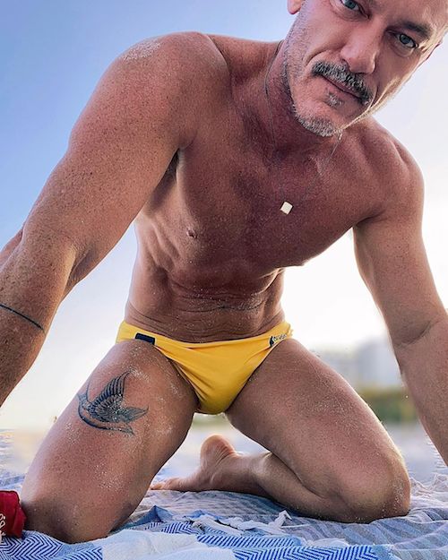 Sguardo ammiccante, slip micro e tatuaggio sulla coscia destra nuovo di zecca, in ginocchio sul telo mare, Luke gioca con i suoi follower e commenta: “Boo“.