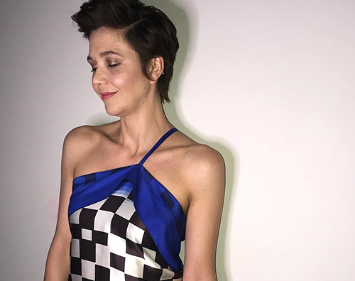 Per l’occasione la star di “Hysteria” ha sfoggiato un vestitino monospalla con stampe geometriche e floreali sui toni del blu, del bianco, ma anche del giallo e del nero. A rendere più rockeggiante la sua mise, capelli cortissimi e ciuffo cotonato effetto eighties.