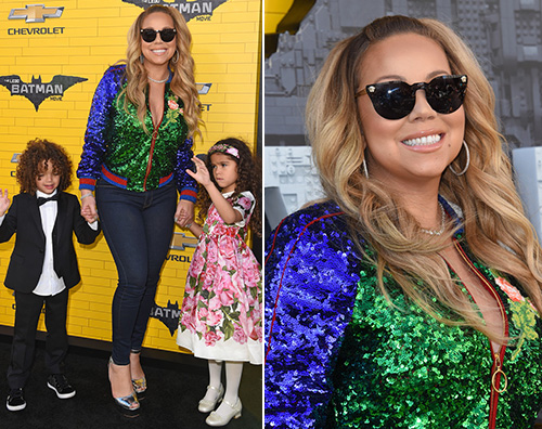 Bomber verde paillettato con zip maliziosamente aperta, ( ma non troppo, dal momento che si è trattato di un evento per famiglie) e skinny jeans, Mariah ha sfilato raggiante davanti ai fotografi stringendo i suoi bambini per mano.