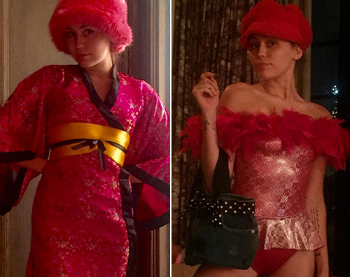 Ecco Miley in versione giapponesina con colbacco e femme fatale piumosa (foto sopra), ma anche in versione cinesina e Arlecchina.