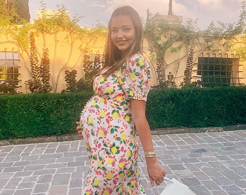 Al bando le classiche salopette premaman, nella foto qui sopra Miranda sfoggia un vestitino con stampa di fiori rossi e limoni, che la rende ancora più fresca e solare, e nel frattempo sfoggia felice il suo pancino.