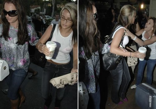 Intanto qui sopra potete vedere un paio di foto di Britney insieme alla sorella Jamie Lynn, costretta ad allontanare una pazza scatenata che urla a Brit di andarsene dal quartiere.
