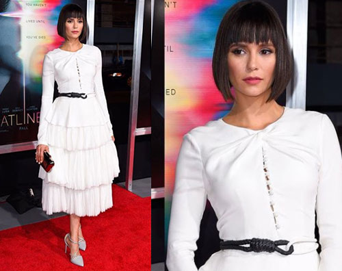 Con un bellissimo abito bianco firmato Prabal Gurung stretto in vita da una cinturina nera, Nina ha calcato il red carpet allestito presso l’Ace Theatre di Los Angeles sfoggiando un bob leggermente asimmetrico sul davanti ed un a inedita frangetta.