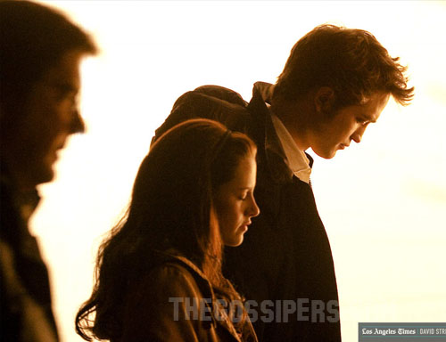 E così ecco Robert Pattinson, Kristen Stewart e Taylor Lautner durante le riprese del film..