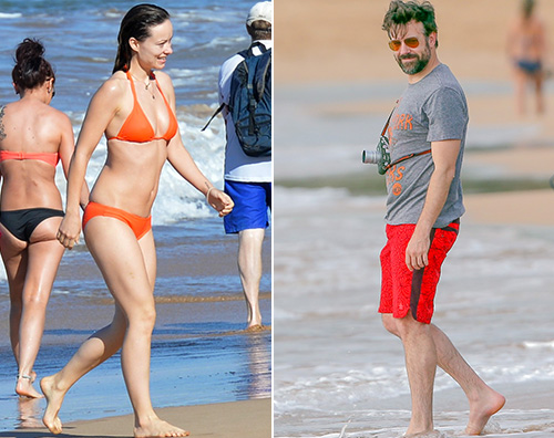 La star di “Cowboy and Alien” è stata pizzicata durante il fine settimana sulla battigia, appena uscita dalle acque dell’ oceano Pacifico e fasciata in un mini bikini arancione, con lei il piccolo Otis– che non compare in foto- ed il suo compagno Jason Sudeikis che nello scatto qui sopra sembra il gemello segreto di Ben Affleck.