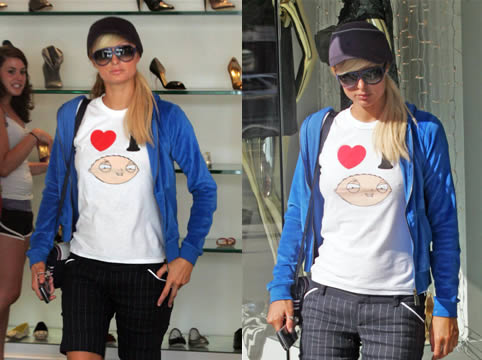 Ecco Paris Hilton mentre, stranamente, fa shopping a Beverly Hills. Come potete notare Paris ha scritto nella sua maglietta “I Love Stewie” (il componente più piccolo della famiglia Griffin). Voglio quella maglia!!