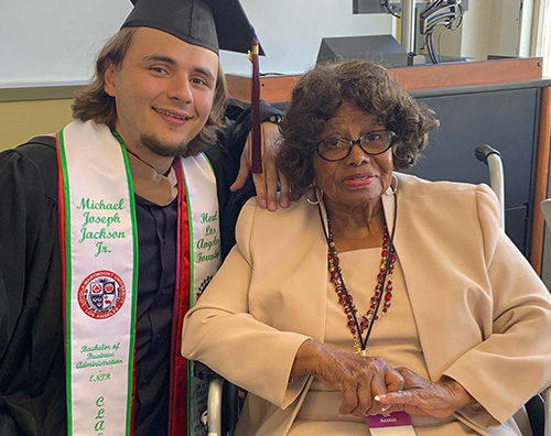 Il 22enne ha completato il suo percorso di studi col massimo dei voti ed è stato festeggiato dai suoi familiari, tra i quali lo zio TJ Jackson, suo tutore legale dal giorno della tragica scomparsa di suo padre Michael. All’evento era presente naturalmente anche nonna Katherine che è arrivata alla proclamazione in sedia a rotelle.