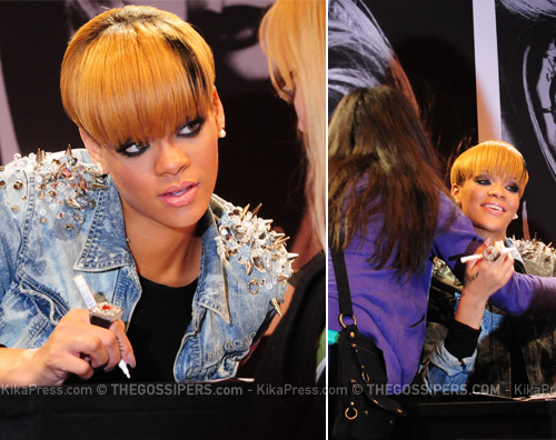La cantante ha firmato copie del suo disco “Rated R”, ha posato per alcune foto, ha spaventato i passanti con la sua acconciatura e ha abbracciato delle ragazzine adoranti (senza sembrare troppo contenta di farlo).