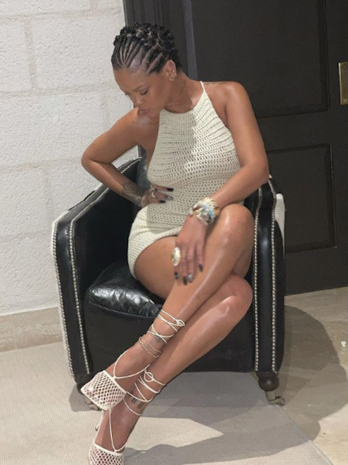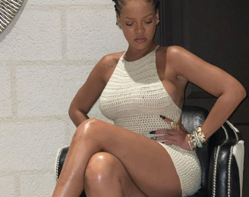 La conturbante star delle Barbados è apparsa su Instagram con le curve fasciate in un tubino crochet color crema indossato senza biancheria intima e così aperto lateralmente da lasciare ben poco all’immaginazione.