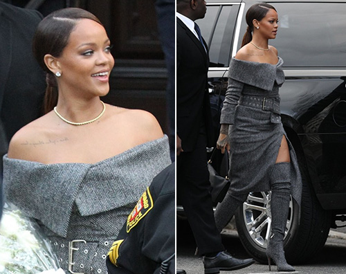 Per l’ occasione, la stella di “Umbrella” non ha certo rinunciato al suo stile personale e si è presentata dinnanzi alla platea con un abitino in tweed con tanto di spacco che metteva in mostra la coscia sinistra e stivali in pendant.