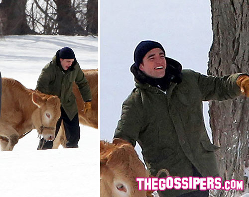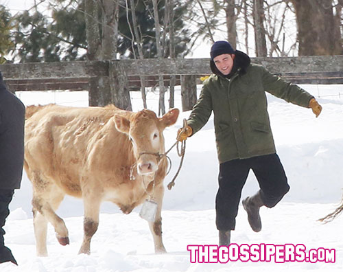 Ieri l’attore è stato fotografato mentre girava alcune scene in mezzo alla neve di Toronto, il tutto in compagnia di due co-stars d’eccezione: un paio mucche!