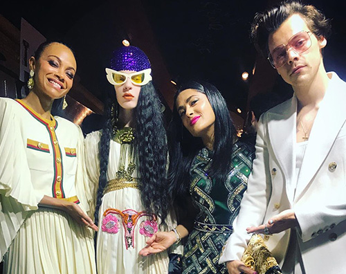 “Dietro le scene della sfilata di Gucci con Zoe Saldana ed Harry Styles” ha scritto la Hayek su Instagram, fresca fresca di trasferta a Cannes.