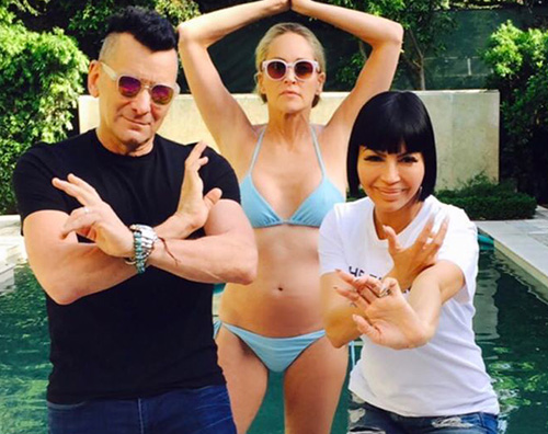 La star di “Basic Instinct” ha appena condiviso sui social uno scatto che la ritrae in bikini, con tanto di addominali tonici in bella vista, in posa con una coppia di amici davanti alla sua piscina.
