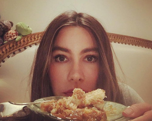 Dopo aver sgobbato per qualche ora, messe da parte scatole e pacchi vari, l’ attrice si è rilassata con una cospicua dose di calorie: