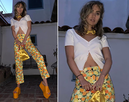 La fidanzata di Robert Pattinson si è calata perfettamente nel mood primaverile di fine anni ’90 e su Instagram ci ha regalato le foto del suo autfit floreale. Pantaloni sui toni dell’arancione e del giallo, ciabatte con zeppona e top color panna che si apre sull’addome scoprendo l’ombelico.