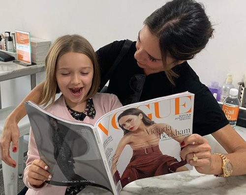 E cosa fanno due donne quando sono insieme dalla manicure? Ovvio: chiacchierano e sfogliano riviste! Nella foto qui sopra, ad esempio, ecco la quartogenita di Vick e David mentre sfodera tutto il suo entusiasmo, leggendo l’intervista della Posh Spice pubblicata sull’ultimo numero di Vogue Australia.