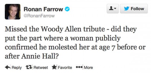 -Ronan FArrow [il cognome Allen è stato tolto] ha dichiarato che suo padre non è stato mai invitato alla sua laurea o ad eventi importanti nella sua brillante carriera di universitario precoce e avvocato dei diritti umani. Attualmente lavora per la casa bianca, per un importante studio legale e per l’Onu, scrive di giurisprudenza su riviste e giornali.